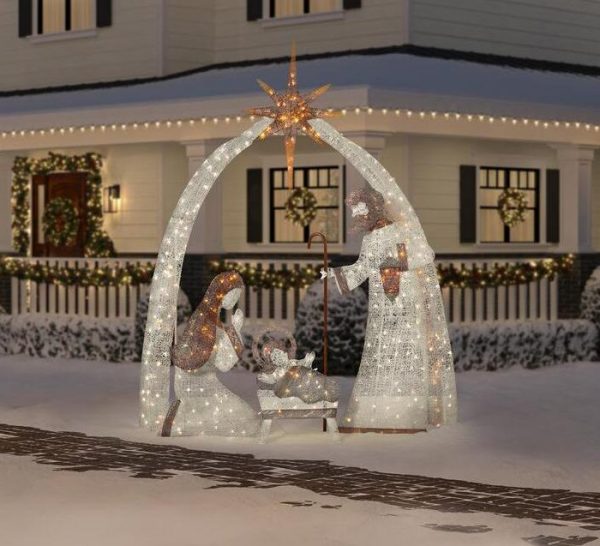 This giant LED Lighted Nativity Scene from Home Accents Holiday is constructed with a durable metal frame covered by a PVC tinsel coating to shine both day and night. This colorful 120 in. tall display features 440 lights expertly arranged on the sculpture to create the optimal lighting effect, sure to brighten your yard all season long.