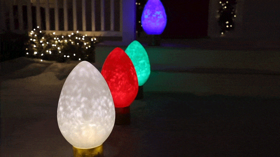Each of the red, green, white and blue bulbs stands a full 20" tall and is illuminated by light projected from the inside of the bulb to glow on the outer surface and reflect warmly on a fresh snowfall.