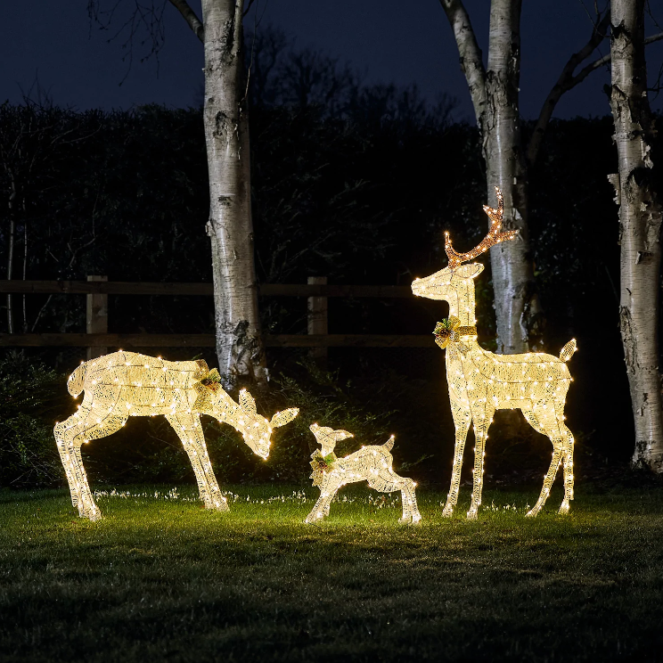 Transform your garden into a winter wonderland this Christmas with our white Haewood stag! A showstopping figure when styled both solo or as part of a festive set up, our stag has an exclusive design and is finished with a hand wound cotton white body, light brown antlers and a sparkling optional silver bow for a soft fairy tale effect. Measuring at a height of 1.3m and featuring 260 hand placed warm white LEDs glowing bright, he’s an eye-catching decoration for your guests this Christmas. Thanks to his weatherproof coating, he is happy to be left outdoors all winter long. Simply position him pride of place in your garden or around your porch and use the floor stand and ground hooks provided for extra stability. All that’s left to do is to plug him in, using the 8m lead cable to find the perfect spot. Set the optional 6 hour timer for guaranteed illumination night after night. Pair with the matching Harewood doe and fawn to complete the display and create a full festive family set up!