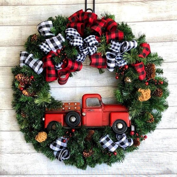 Large Black and White Buffalo Plaid Xmas Truck Wreath with Red Mini Truck, Jingle bells, Colorado Blue Spruce pinecones, holly and a mix of buffalo plaid ribbon. I use only the best quality of everything. With mixed pine wreath and ribbon wrapped hanging wire.