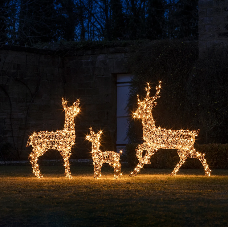 Bring the magic home this Christmas with our Studley light up reindeer stag. Designed in house, this exclusive reindeer stands at 1.25m and features a handmade brown faux rattan frame with 260 hand placed warm white LEDs for a stunning seasonal sparkle that encapsulates the true magic of Christmas. The delicate design of the stag pays attention to the smallest details of a real reindeer to make him look as realistic as possible. Handmade from durable brown faux rattan and with a floor stand for extra stability, your stag is happy outdoors come rain or shine! Simply secure into the ground with the metal hooks provided and place on the 6 hour timer timer for an automatic illumination at the time each evening. Style alone or with our other 8 Studley family members for the perfect family favourite for any Christmas display!